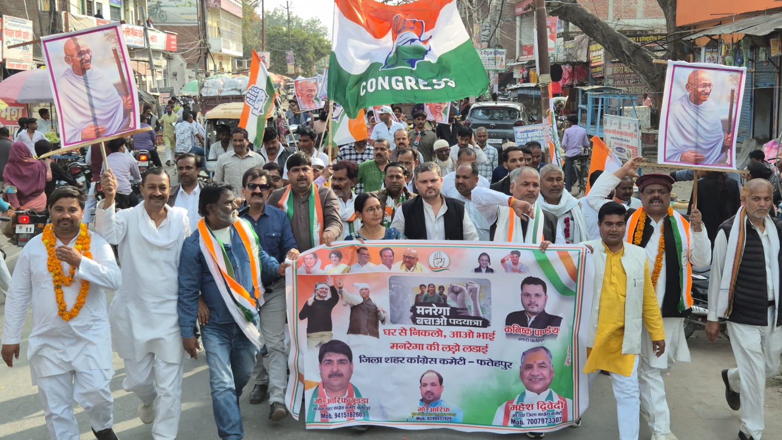 आज खागा विधानसभा के ग्राम त्रिलोचन पुर से तमाम ग्रामीण क्षेत्र होते हुए खागा नगर पंचायत तक लगभग सोलह किलो मीटर कांग्रेस पार्टी ने ग्रामीण मजदूरों को साथ लेकर पद यात्रा की । पदयात्रा में महिलाओं के संग भारी तादाद में मौजूद ग्रामीण सरकार विरोधी एवं मनरेगा बचाओ के नारे लगाते हुए नगर पंचायत में लगी गांधी प्रतिमा में माल्यार्पण कर यात्रा की समाप्ति की। पैदल यात्रा का नेतृत्व प्रदेश से नियुक्त प्रभारी कनिष्क पांडेय, जिला अध्यक्ष महेश द्विवेदी, शहर अध्यक्ष आरिफ गुड्डा, ने किया। इसके पहले त्रिलोचन पुर गांव में आयोजित सभा में जिला अध्यक्ष महेश द्विवेदी ने भाजपा सरकार की सभी जन विरोधी नीतियों की खुल कर आलोचना की उन्होंने कहा कि अब मोदी जी को भारत की जनता पूर्ण रूप से पहचान चुकी है एवं उन्हें नकार चुकी है। शहर अध्यक्ष आरिफ गुड्डा ने भी कहा कि जिस प्रकार जनता को गुमराह कर मोदी जी ने उनके साथ विश्वासघात किया है देश कभी भूल नहीं सकता उन्होंने आगे कहा कि मोदी जी भारत के पहले ऐसे प्रधानमंत्री हैं जिन्हें अब जनता घृणा की दृष्टि से देख रही है एवं उन्हें कुर्सी से उतारने को व्याकुल है। पैदल यात्रा में मुख्यरूप से महिला नेता माधुरी रावत, प्रकाश पाण्डेय. हेमलता पटेल,वरिष्ठ नेता राजेंद्र शुक्ला, कलीम उल्ला सिद्दीकी, रंजीत मौर्य, देवी प्रकाश दुबे, आरिफ खान, असगर अली. आदित्य श्रीवास्तव, सैयद सहाब अली, रामलखन बाजपेई राम नरेश महराज,ओमप्रकाश कोरी नौशाद अहमद चौधरी मोइन राइन, नवनीत तिवारी, निजामुद्दीन, डॉ अब्दुल हमीद, नसीम अंसारी आदि सैकड़ों कार्यकर्ता एवं ग्रामीण मौजूद रहे।