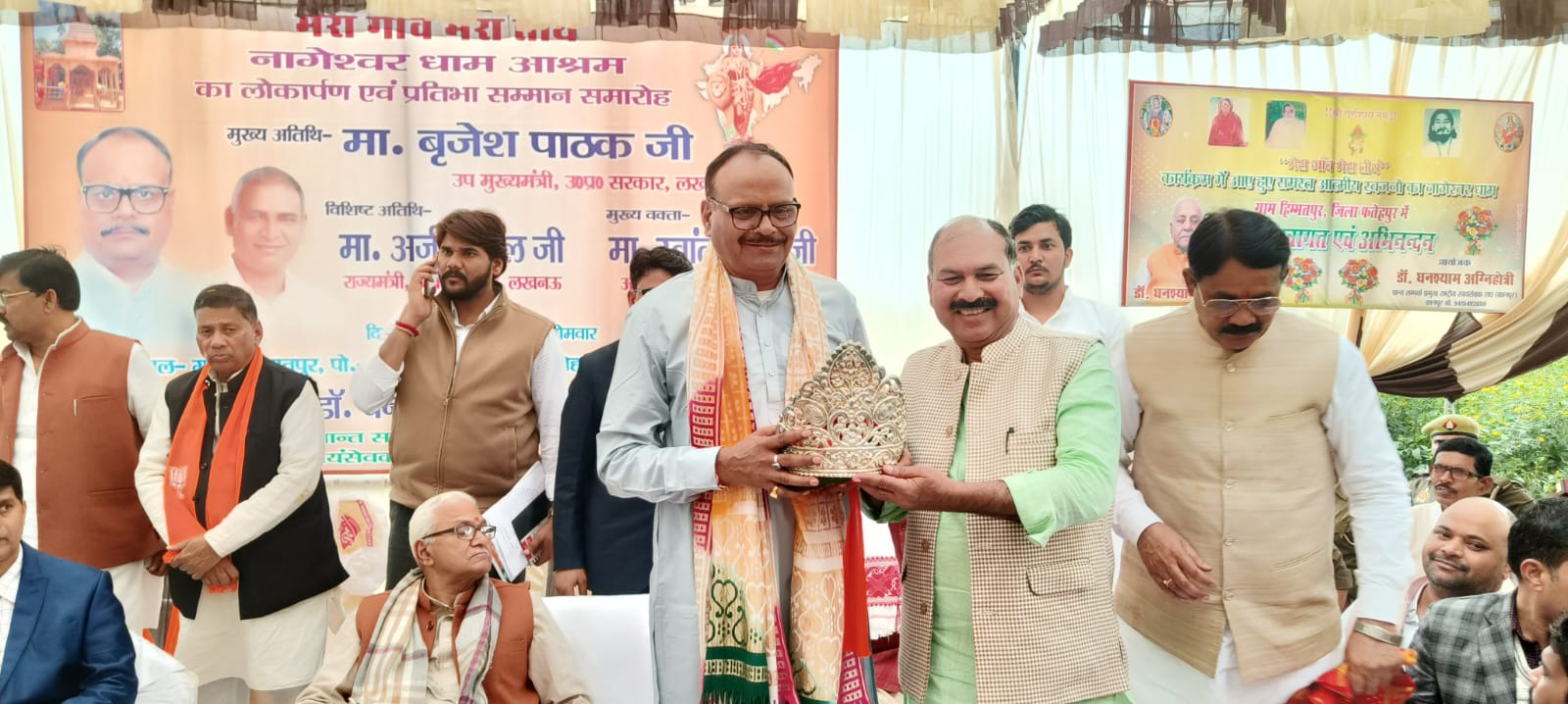 यूपी के फतेहपुर जिले के ललौली क्षेत्र के ग्राम हिम्मतपुर में मेरा गांव मेरा तीर्थ कार्यक्रम के तहत आयोजित समारोह में उप मुख्यमंत्री बृजेश पाठक शामिल हुए। इस दौरान उन्होंने नागेश्वर धाम आश्रम का लोकार्पण किया और प्रतिभा सम्मान समारोह में मुख्य अतिथि के रूप में प्रतिभाशाली लोगों को सम्मानित किया। डिप्टी सीएम ने मंच से गांव की मिट्टी से जुड़ने का संदेश देते हुए कहा कि ऐसे कार्यक्रम हमारी सांस्कृतिक जड़ों को मजबूत करते हैं।SIR वर्ष 2003 में भी हुआ था। SIR को लेकर यदि कोई नोटिस जारी होती है तो उसका प्रमाण पत्र चुनाव आयोग को देना होगा, बजट पर बड़ा बयान प्रदेश और केंद्र सरकार के बजट को लेकर उन्होंने कहा कि यह