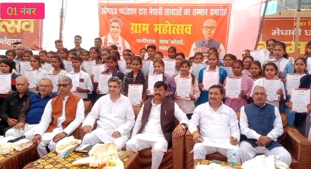 फतेहपुर(वीटी)। जिले के बल्दीधाम ग्राम कोढ़ई स्थित प्राचीन शिव मंदिर में ओमराज़ फाउंडेशन द्वारा ग्राम महोत्सव का आयोजन किया गया। इस दौरान रुद्राभिषेक,जलाभिषेक,सुंदरकांड पाठ,हवन-पूजन और पारंपरिक आल्हा गायन के माध्यम से श्रद्धालुओं ने भगवान शिव की आराधना की।कार्यक्रम में 51मेधावी छात्र-छात्राओं को बलदेवश्री सम्मान” से सम्मानित कर उनकी शिक्षा के लिए आर्थिक सहायता दी गई।मुख्य अतिथि विधान परिषद सदस्य साकेत मिश्रा और विधायक जय कुमार सिंह जैकी ने विद्यार्थियों का उत्साहवर्धन करते हुए मेहनत और लगन से आगे बढ़ने की प्रेरणा दी।फाउंडेशन के अध्यक्ष राजेंद्र सिंह उर्फ रज्जु भैया ने कहा कि संस्था समाज सेवा और शिक्षा के क्षेत्र में ऐसे कार्यक्रम आगे भी जारी रखेगा।