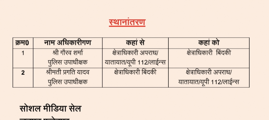 फतेहपुर।पुलिस अधीक्षक अनूप कुमार सिंह ने एक बार फिर उप पुलिस अधीक्षकों का स्थानांतरण किया है उन्होंने बिंदकी सीओ प्रगति यादव का स्थानांतरण करते हुए उन्हें पुलिस लाइन व यातायात को दुरुस्त करने की जिम्मेदारी सौंपी है वही गौरव शर्मा को बिन्दकी सर्किल की नई जिम्मेदारी दी है।