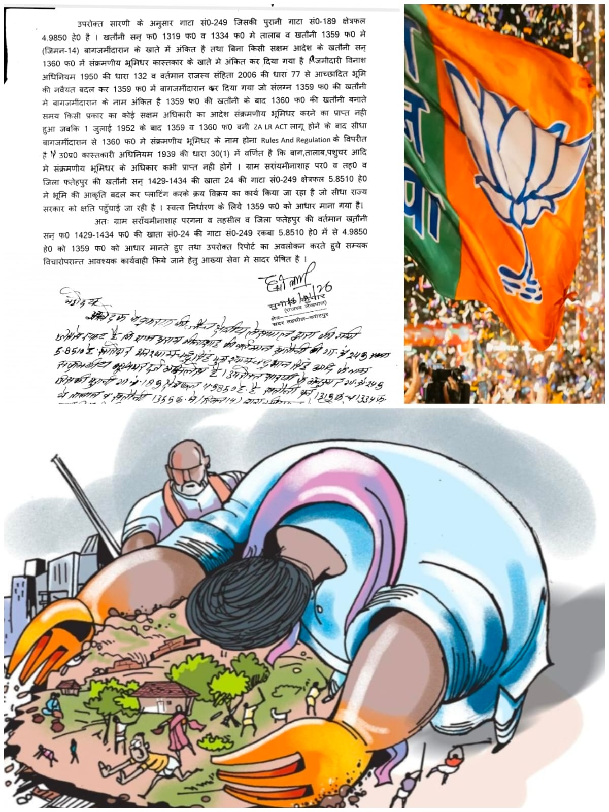 ✍🏿*बड़ी अजब-गजब की है भारतीय जनता पार्टी की सरकार।* सुशासन,भ्रष्टाचार रहित प्रशासन एवं गुंडा माफियाओं पर लगाम लगाने का दावा करने वाली भाजपा के नेताओं में ही जब ये गुण आ जाएं तो सरकारी दावे खोखले व बेईमानी नजर आते हैं। *फतेहपुर जिले में हालात यह हो गए हैं कि भू-माफियाओं ने ऐसी भगवा चादर ओढ़ी की उनका हर ऐब भी मंदिर सा पवित्र नजर आ रहा है।* सरकारी दफ्तरों एवं थानों में मची लूट के साथ सत्ताधारियों ने जमीनों को लेकर अपना ऐसा जाल बिछाया है कि उनकी मनमानी के आगे जिला प्रशासन घुटनों के बल है। *सत्ता के इर्द-गिर्द रहने वाले भारतीय जनता पार्टी के एक बड़े नेता ने ऐसी हिमाकत कर डाली कि उसने जेल की एक बीघा जमीन व सरकारी रास्ते तक को बेंच डाला।मामला सत्ता का होने के चलते अफसरों की चुप्पी है तो मलाई खाने के चक्कर में राजस्व कर्मी उसी की हां में हां मिला रहे हैं।*  नेता जी के यही नहीं एक के बाद एक अनगिनत ऐसे कारनामें हैं जो जिला प्रशासन व सरकार को उनके दावों को चुनौती खुल्लम-खुल्ला दे रहे हैं। *अब उन्हीं की पार्टी के एक बड़े कद्दावर नेता ने मोर्चा खोल दिया है जिससे उनकी ₹100 करोड़ से अधिक की जमीनों में ग्रहण लग गया है।सत्ता संरक्षित माफियागिरी इस कदर बढी हुई है कि भ्रष्टाचार की एक परत खुलती है तो दूसरी पहले से ही उधड़ी नजर आती है।* बावजूद इसके ईमानदारी के दावे कर ‘राम-राज’ वाली सरकार का बखान करने के लिए भाजपा में सत्ता के 09 वर्ष पूरे होने का जश्न मनाया जा रहा है।